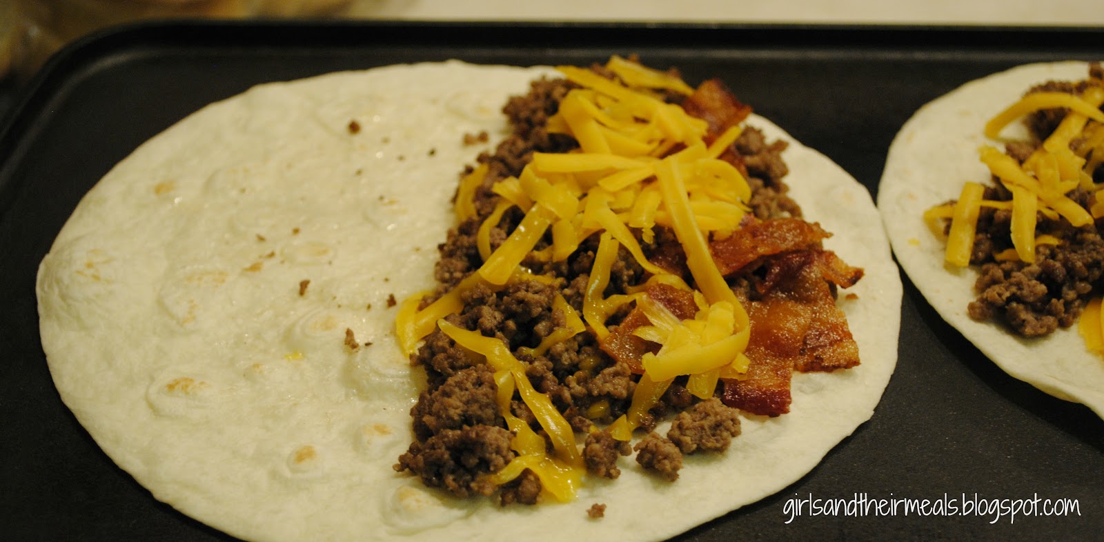 Spray a large griddle, or skillet and lightly cook both sides of tortillas. Add meat, cheese and bacon on one half of the tortilla. Cook a minute or so longer until cheese starts to melt.